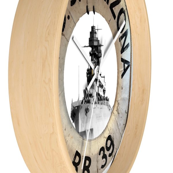 Every second counts! Support the U.S.S. Arizona “Operation 85″ Project with this 10″ Wall Clock. Our beautiful life ring design, pictured with the magestic U.S.S. Arizona battleship BB-39 within. A great item or gift for any Navy, WWII or Pearl Harbor history buff. An exciting and practical accent in any room, this unique high quality Wall Clock serves as a statement piece of an inconic ship. .: Wooden frame .: Plexiglass face .: Pre-installed backside hook .: For indoor use .: Requires one AA battery (NOT included) .: Silent clock mechanism .: Life Ring printed on flat surface of clock .: 10″ round by 2” thick