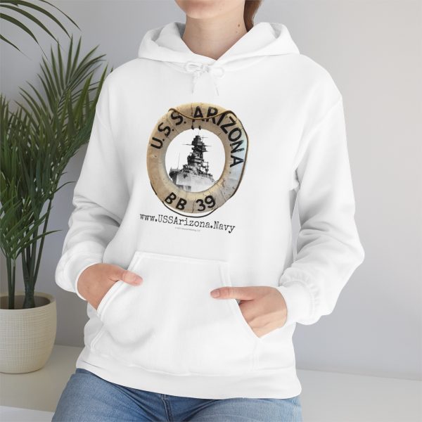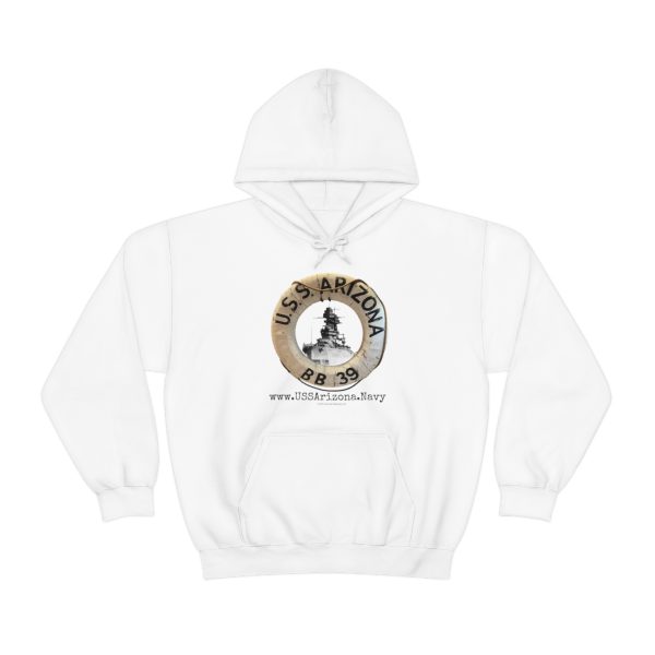 Show your support of the U.S.S. Arizona Project with this unisex hooded sweatshirt. Our beautiful life ring design, pictured with the magestic U.S.S. Arizona battleship BB-39 within. A great item or gift for any Navy, WWII or Pearl Harbor history buff.