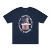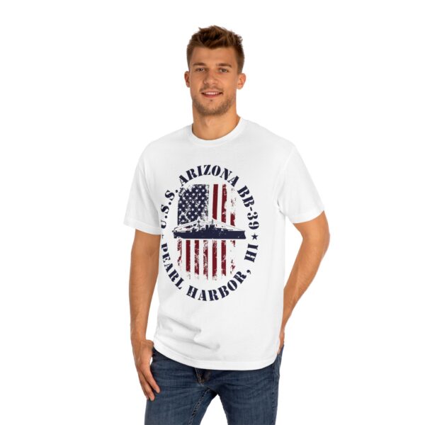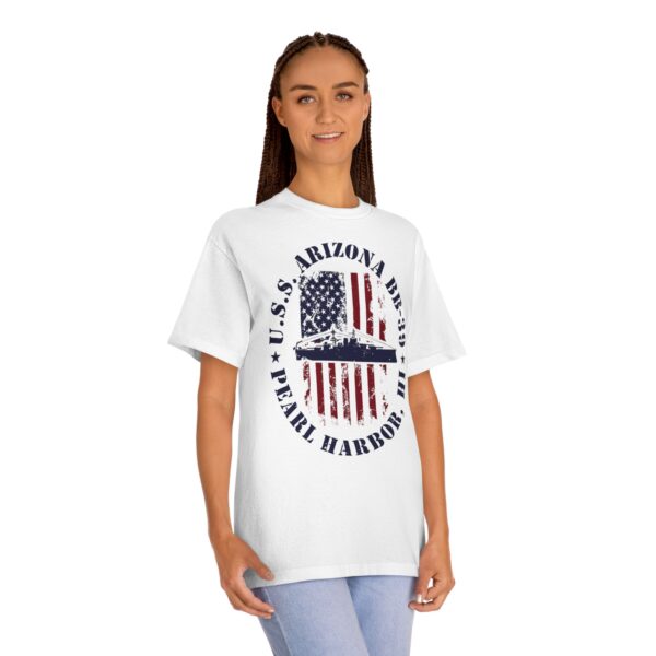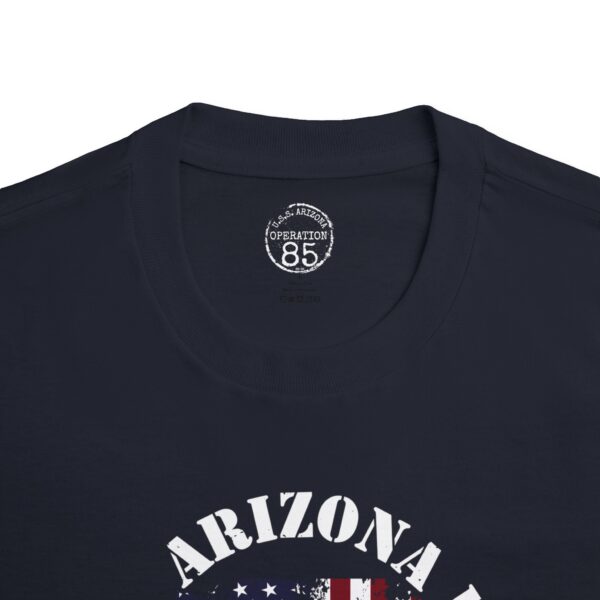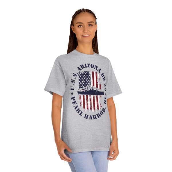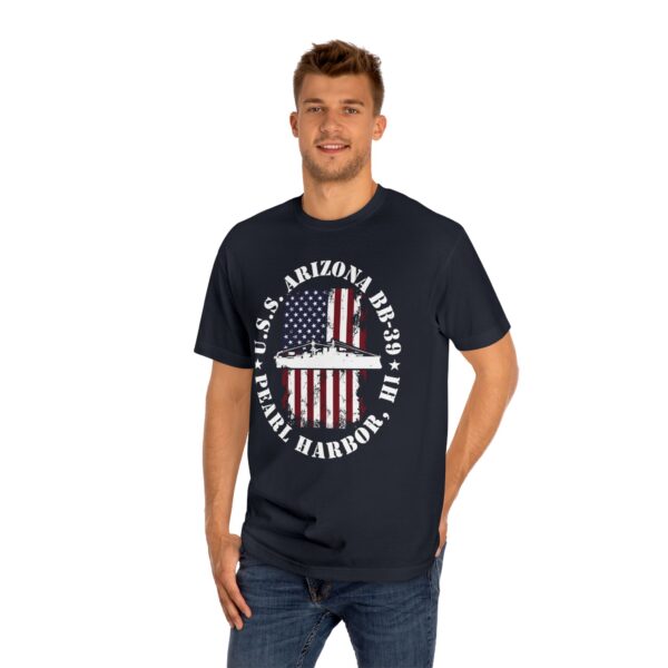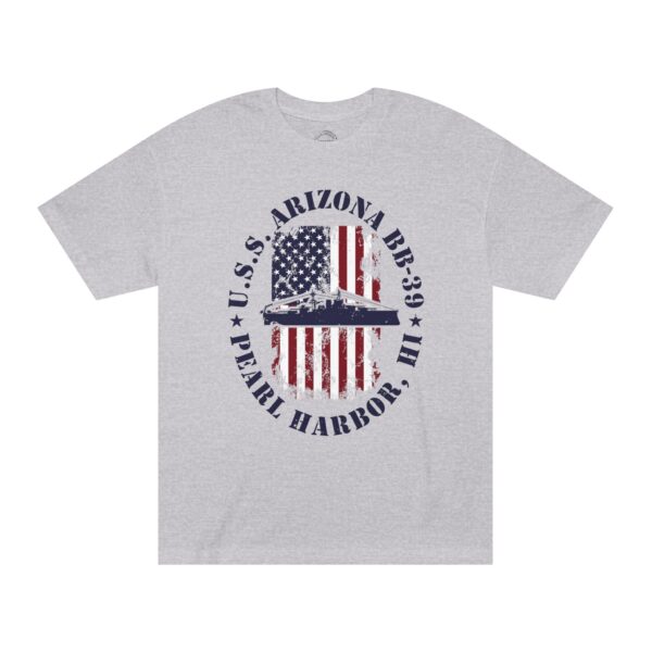 Stand tall in American pride with this bold USS Arizona BB-39 Patriotic Tee, featuring a distressed U.S. flag backdrop in an oval shape and powerful silhouette of the iconic battleship. It’s more than just a shirt — it’s a tribute to the 1,177 brave souls lost on December 7, 1941, and a salute to those who continue to serve our country.